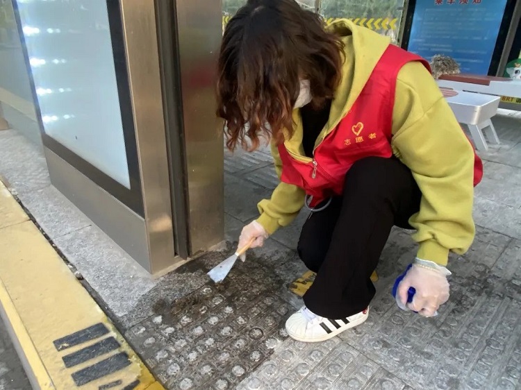 活动中,志愿者们分为7个行动小组,他们携带长梯、刷子、鸡毛掸、铲刀等各种清扫工具,对解放路、开放大道、新都路沿线的23座重点站台进行专项清理。