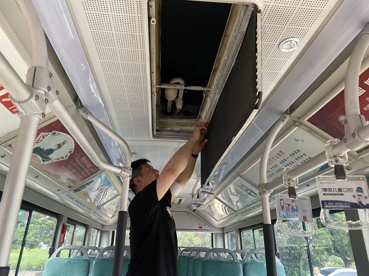 高温天气下车载空调工作时间长、负荷大,故障率也高。男同志们用自带的工具拆下车顶的空调盖板,用水管冲洗滤网和过滤海绵上的残留灰尘,清洗后再重新安装回车内。