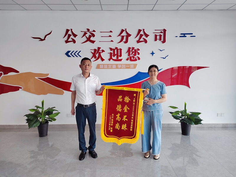 9月7日上午,市公交三分公司收到市民送来一面印有“拾金不昧、品德高尚”字样的锦旗,对4路驾驶员梁健拾金不昧的高尚行为表示感谢和赞扬。