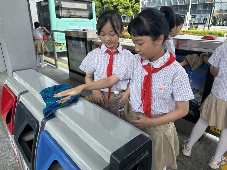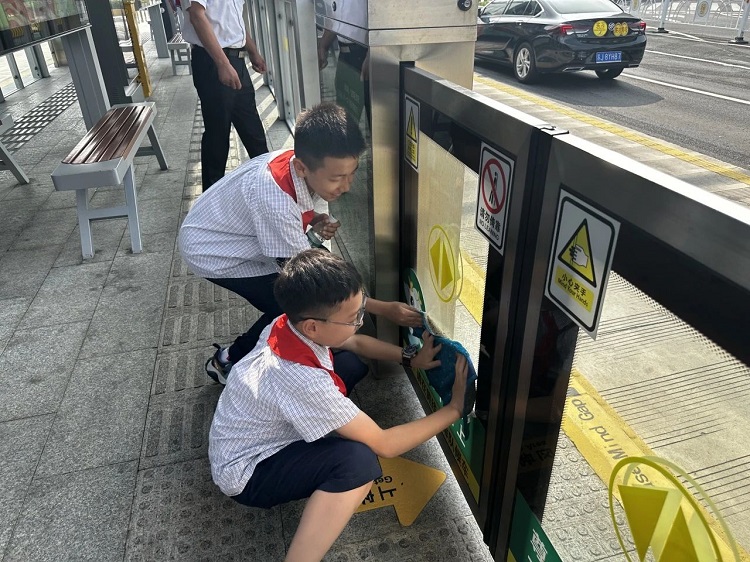 安全教育课结束后,孩子们在志愿者及老师的引领下,开展了一场别开生面的爱心志愿活动。小小的个头拿着沉甸甸的清洁工具,干起活来却毫不马虎,他们分工明确、整齐有序地清理站台卫生,不一会儿便将站台“打扮”得干净整洁,为广大乘客送上了一份温馨服务。